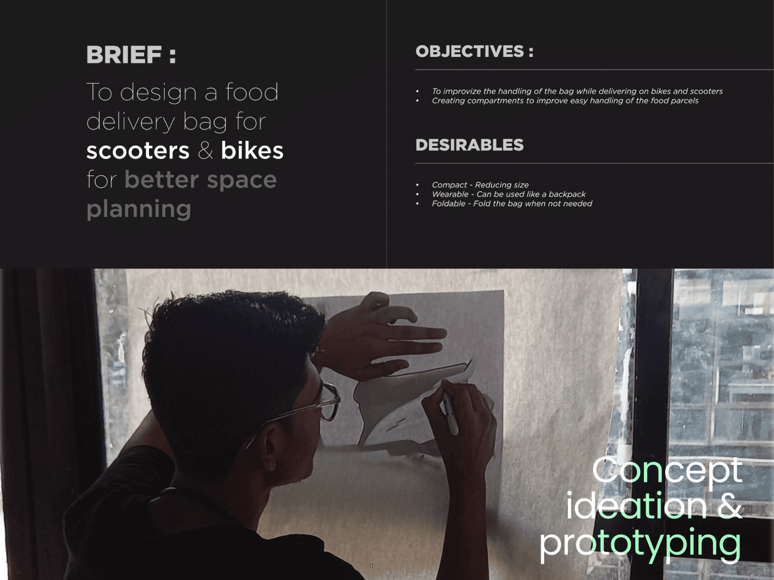 The project was an outcome of Simple product design course where the food delivery bag was designed by conducting research with more than 50 delivery agents in Ahmedabad city.