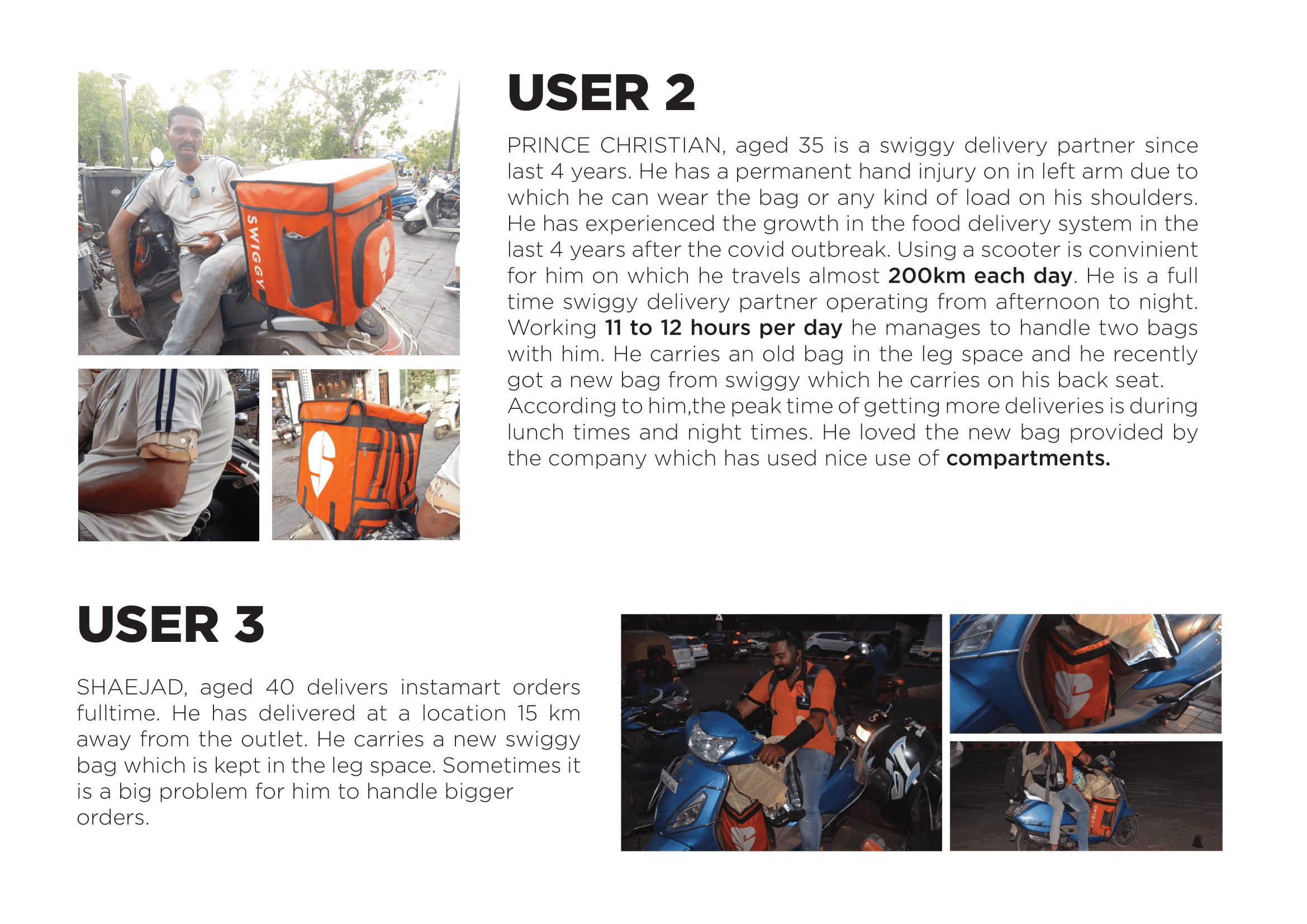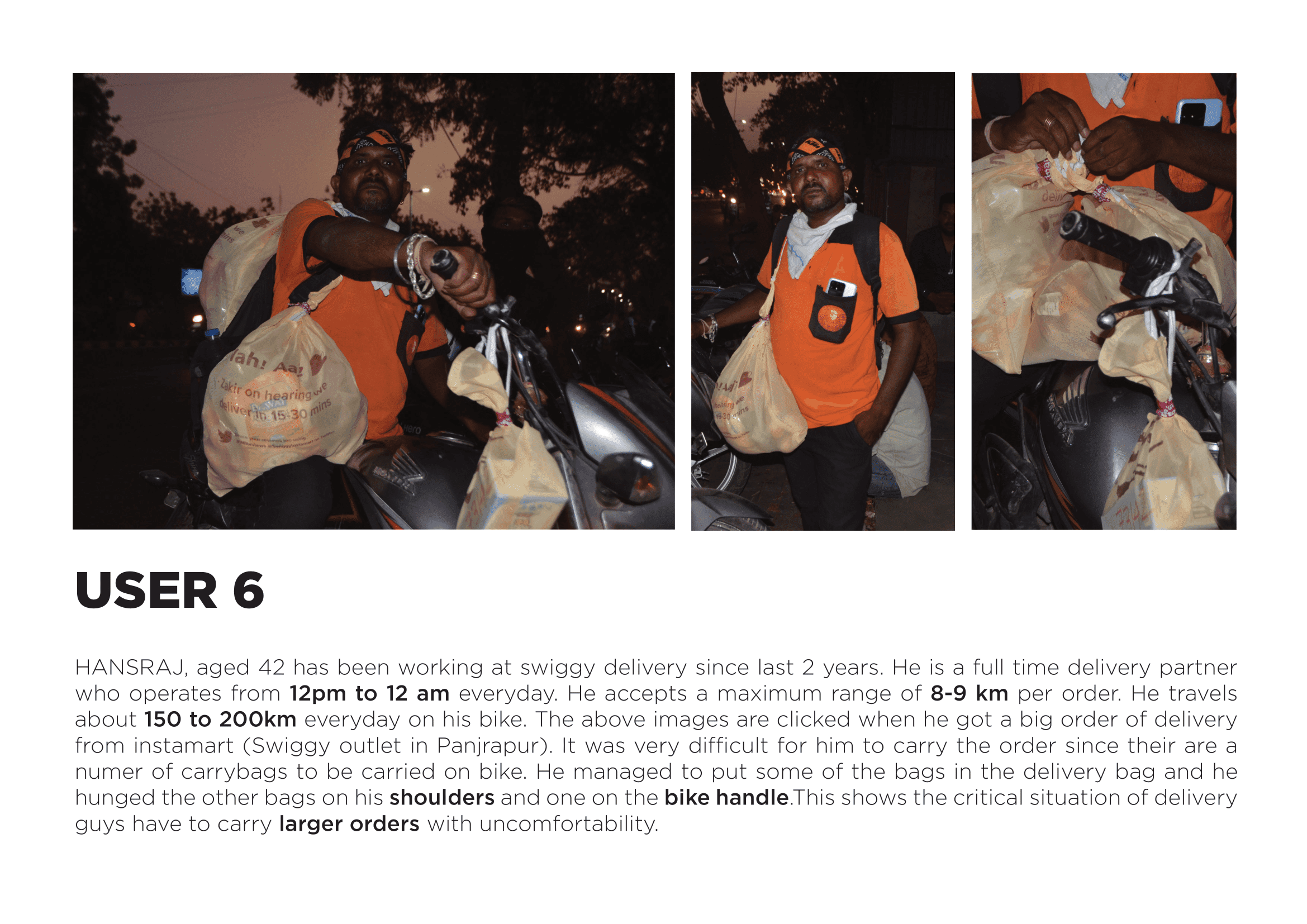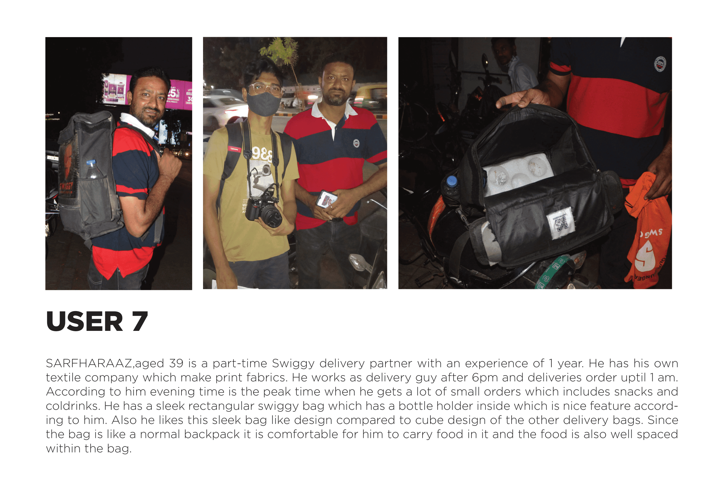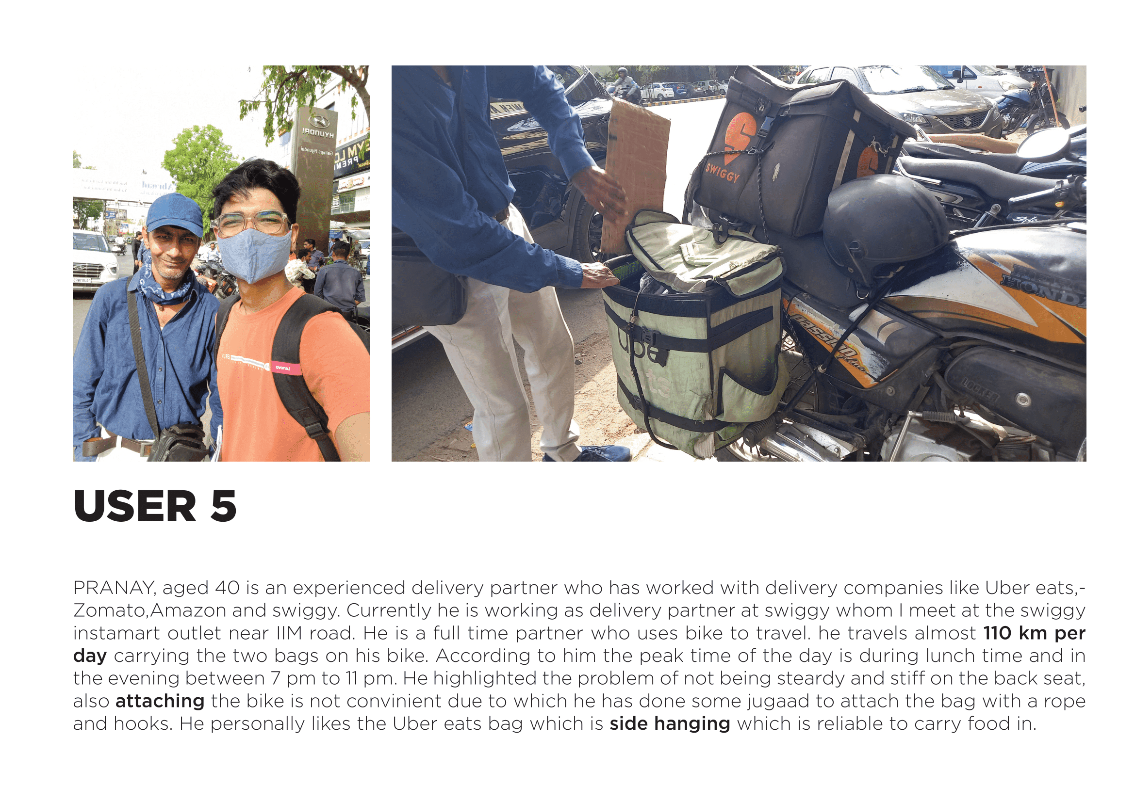 Basic details of the rider such as the age,vehicle used working hours, bag details, distance travelled was also recorded with contact details for future feedback or contacting. Engagement with the delivery partners as a friend was encouraged eliminating the concept of interview. The delivery guys were open to discuss their issues and their lifestyle which was the most exciting and engaging part of the research process.