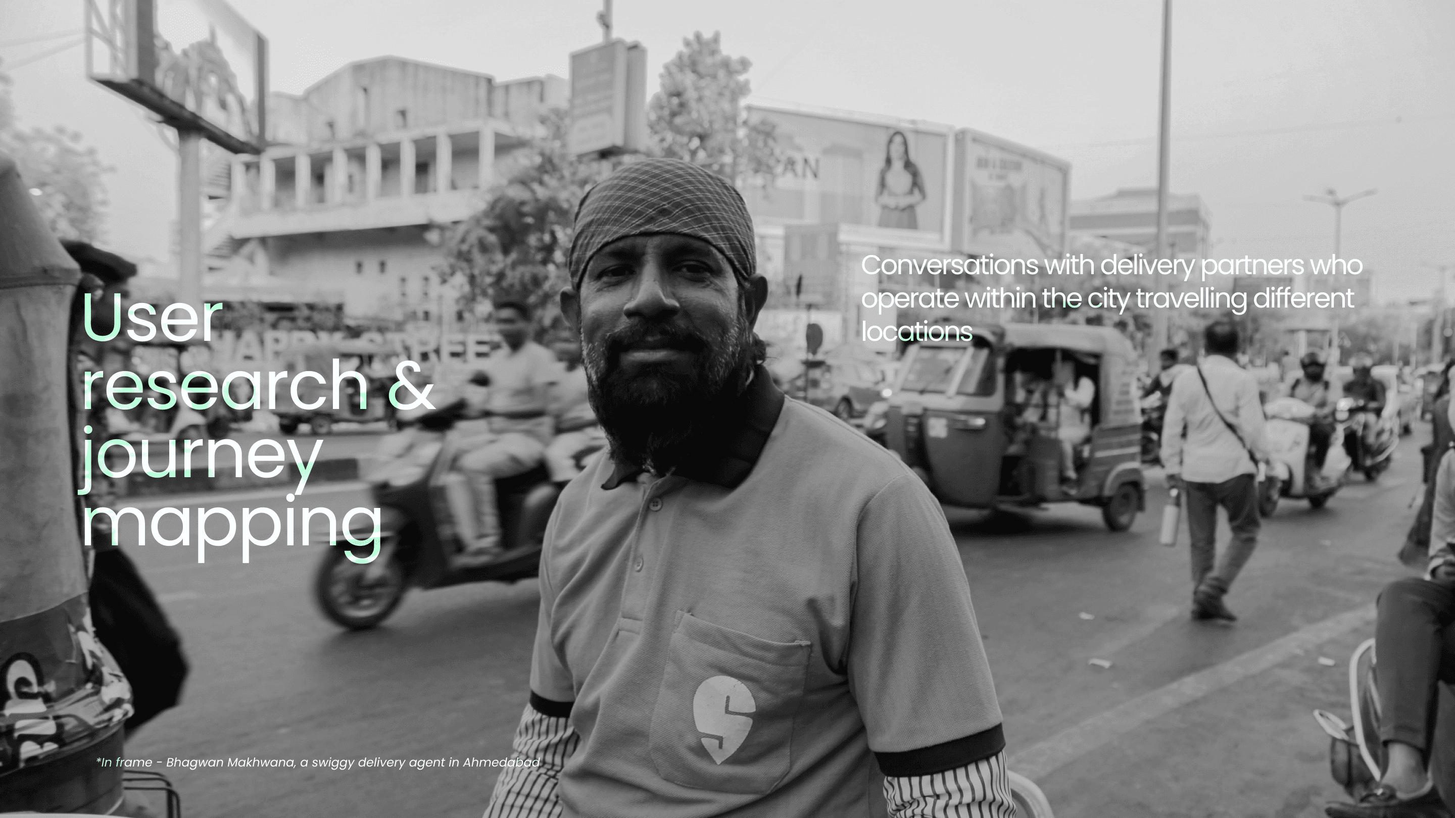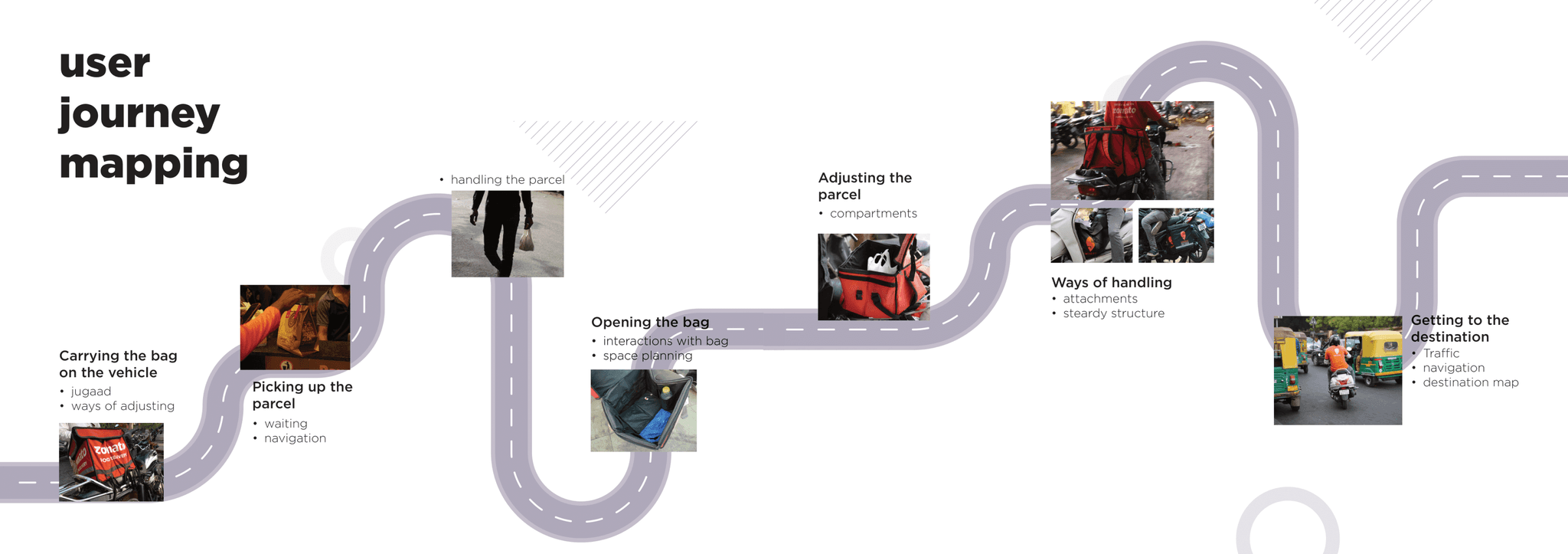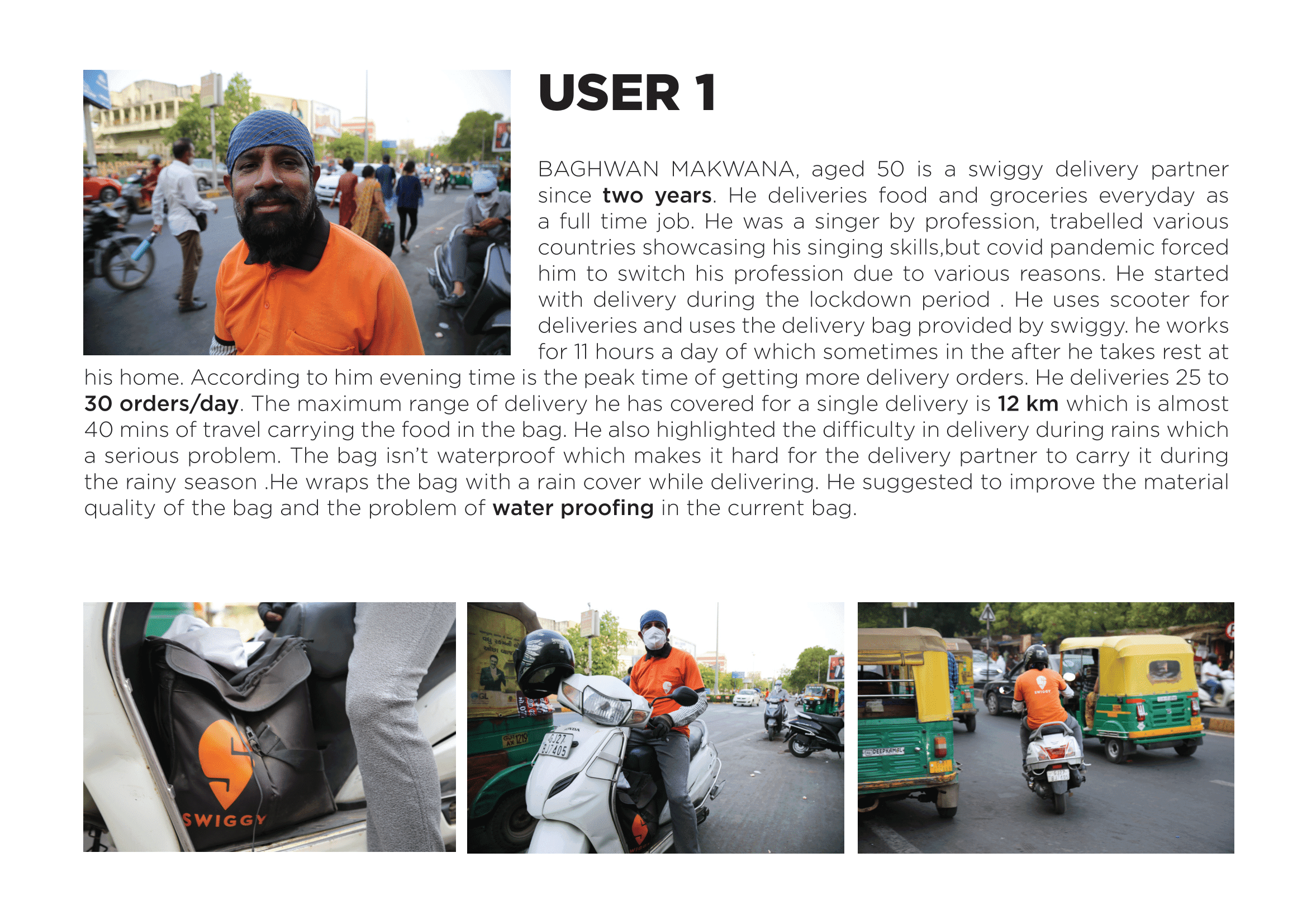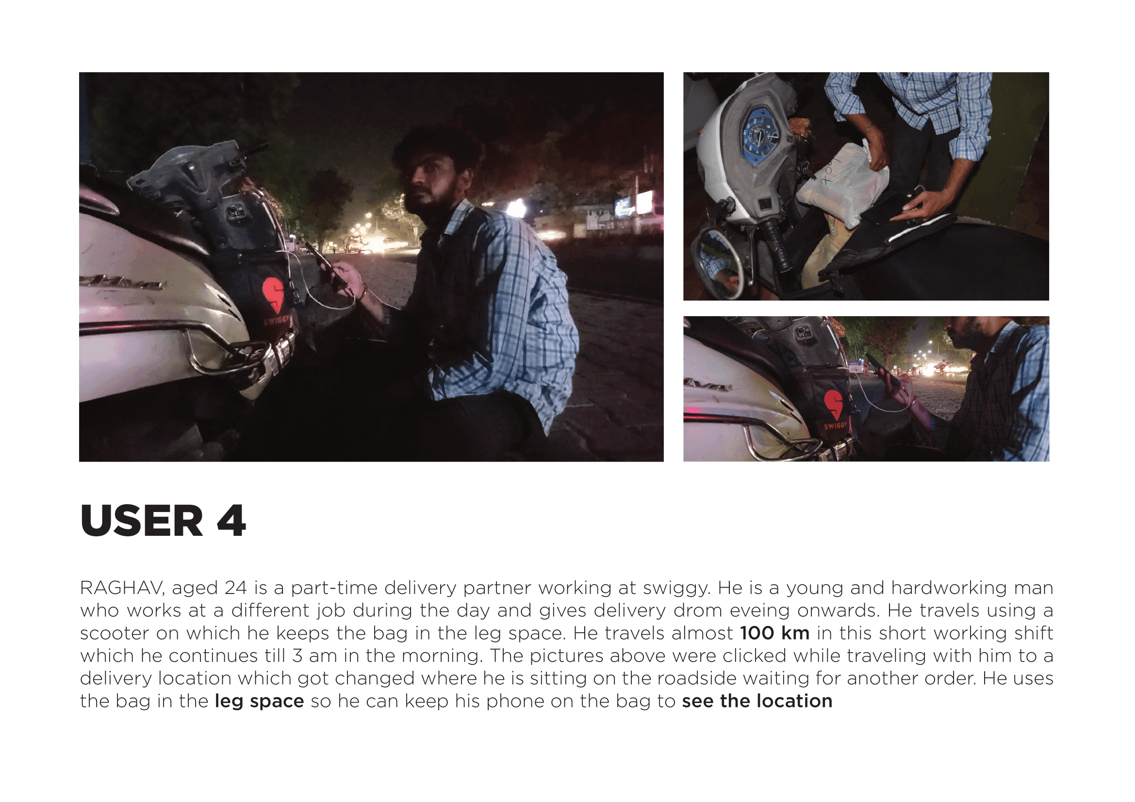 Basic details of the rider such as the age,vehicle used working hours, bag details, distance travelled was also recorded with contact details for future feedback or contacting. Engagement with the delivery partners as a friend was encouraged eliminating the concept of interview. The delivery guys were open to discuss their issues and their lifestyle which was the most exciting and engaging part of the research process.