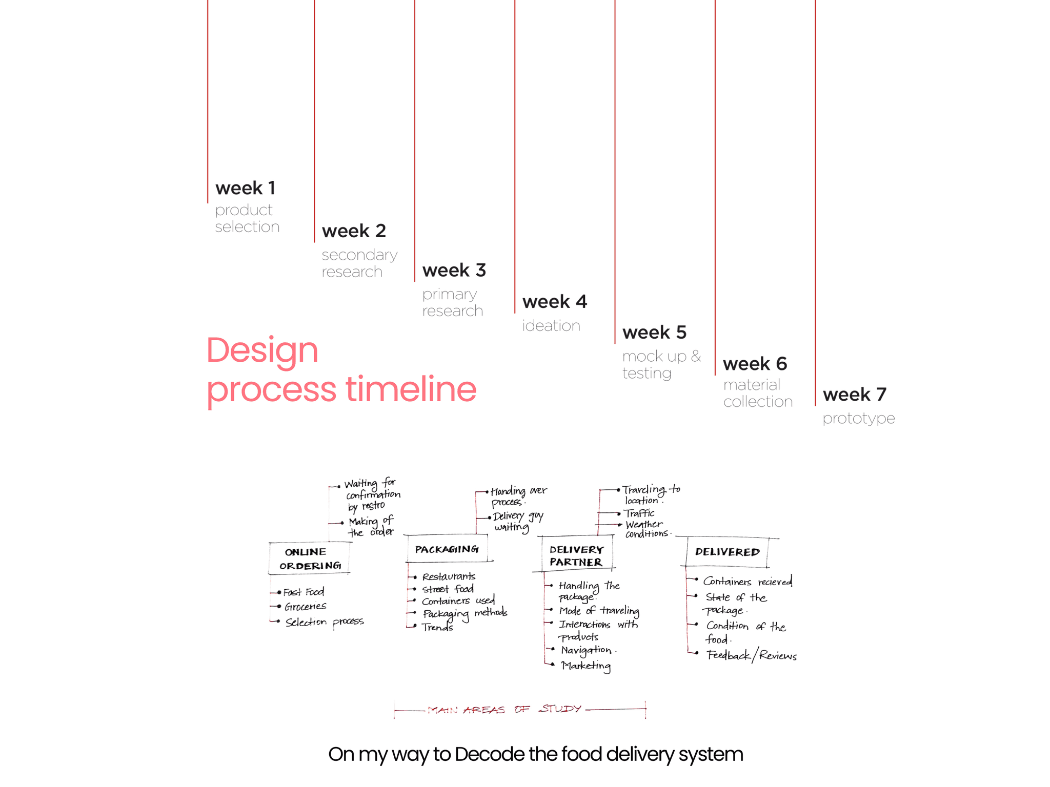 The project began with a structured 7-week plan, divided into research, ideation, material selection, and prototyping phases with basic understanding of the food delivery system
