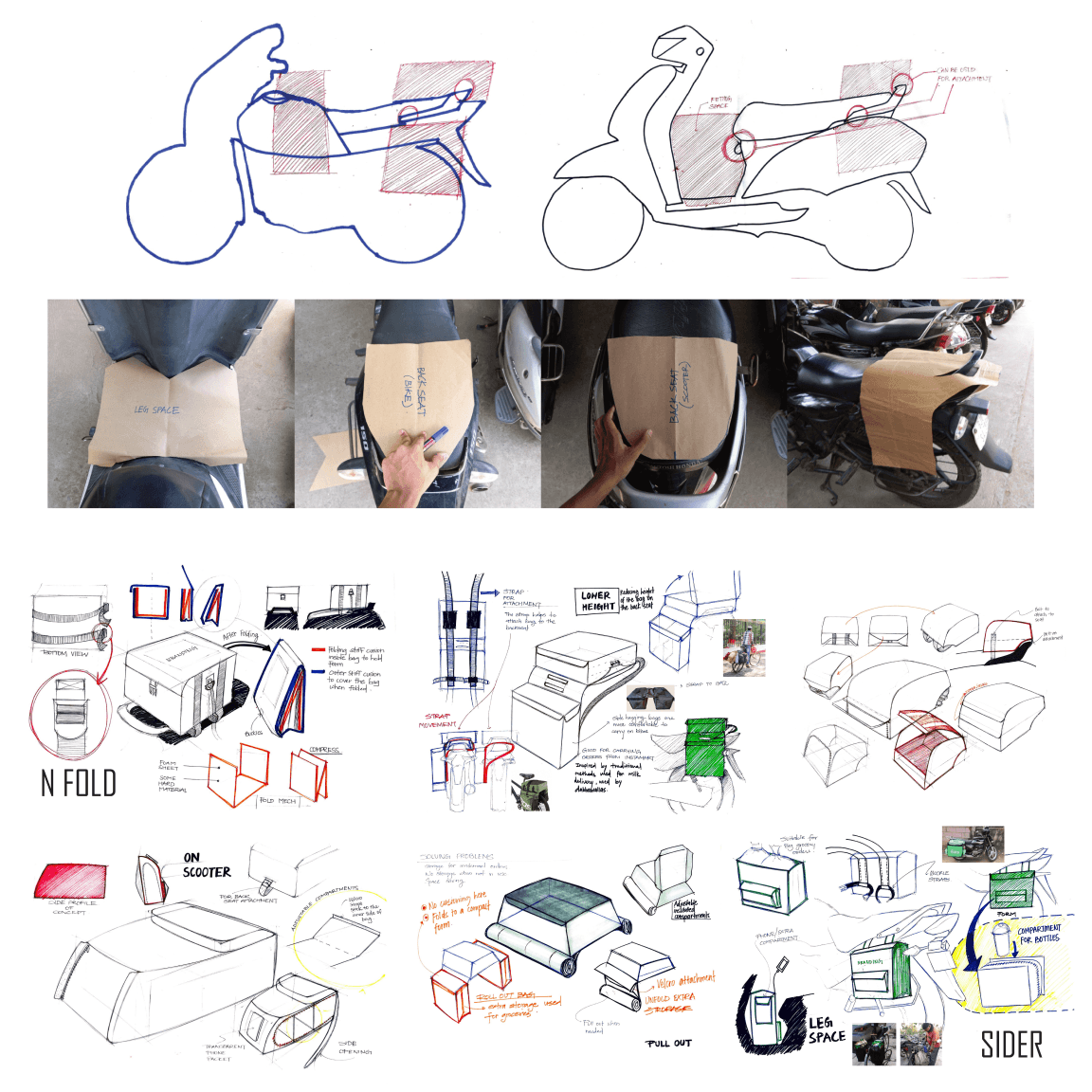 To solve the problem of handling of the bag, I spent time around different bikes, scooters & cycles to get the best iteration of the bag pattern which will fit most of the vehicles with minimum use of space.