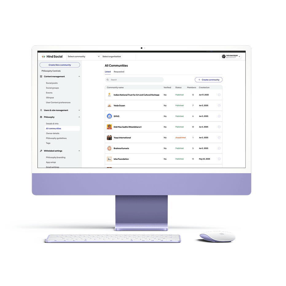 Hind Social was envisioned as a digital ecosystem for Indian communities , enabling organizations, local groups, and individuals to connect, organize, and collaborate.The goal was to build a scalable, modular system that could power multiple community types , from cultural groups to volunteer networks - under one connected platform.