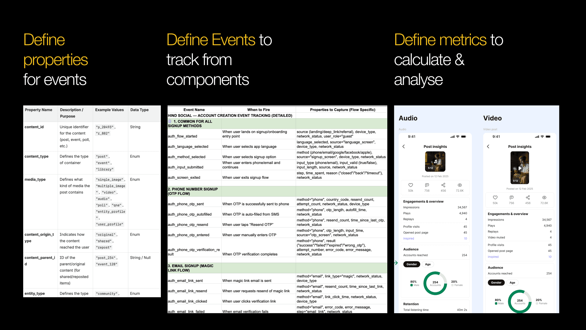 Establishing metrics to evaluate engagement, retention, and content performance for different media types like posts, videos, and audio.