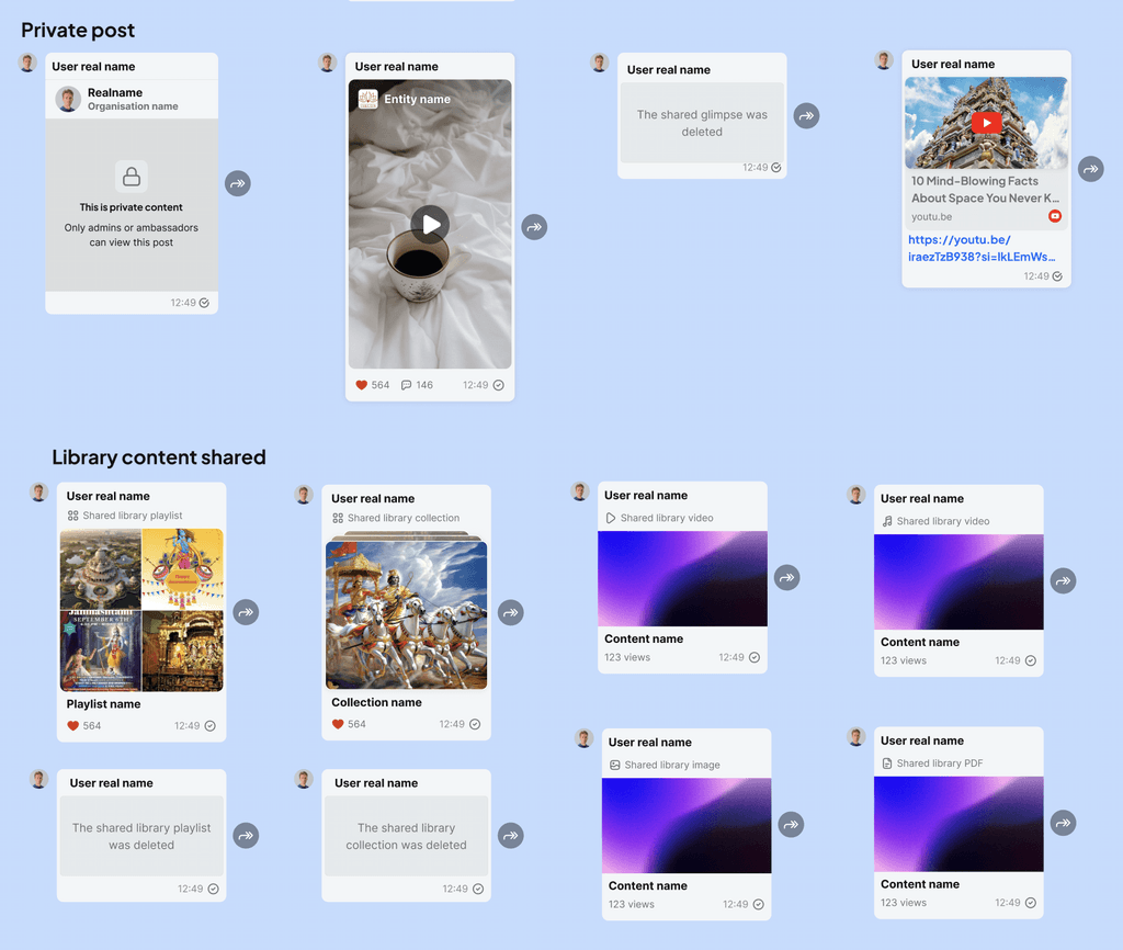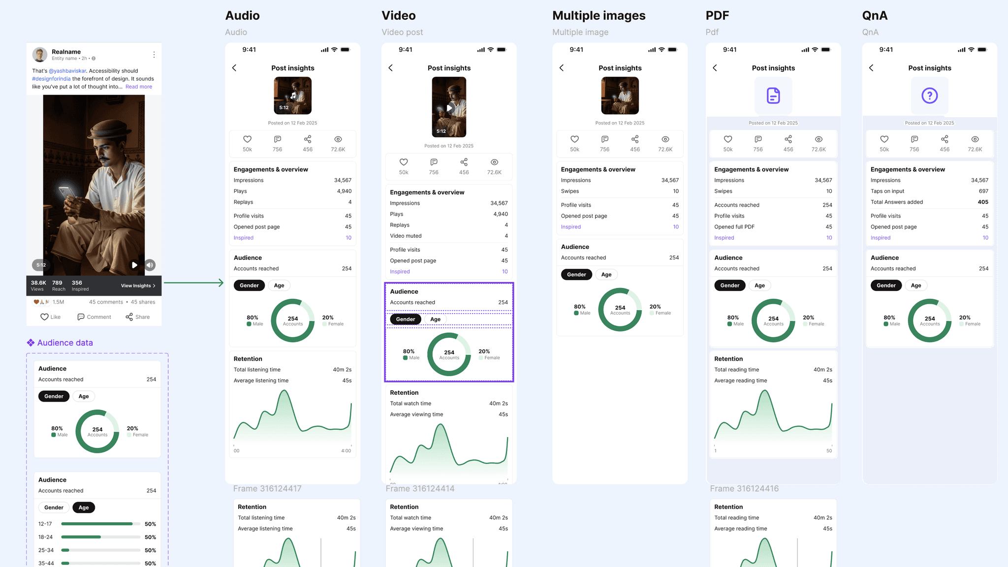 This is an example of post insights of multiple types of posts from the platform. In order to make these insights the component documentation included event tracking triggers which are part of component structure. The triggers are used to generate multiple metrics in the platform
